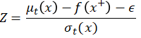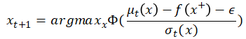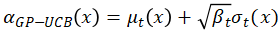 以及x*是f取最大值的实际位置。从本质上讲,我们在尝试选择一个点,以最大程度地减少与目标物的距离。不幸的是,我们不知道真实函数f。Mockus提出了采集函数如下来克服该问题:
