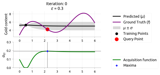 正如我们预期的那样,将值增加到ϵ = 0.3会使采集函数进行更多的探索。与早期的评估相比,我们看到了更少的开发。我们看到它只评估全局最大值附近的两个点。