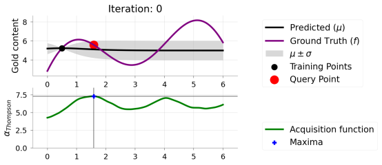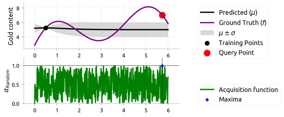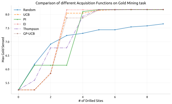 Srinivas等制定了β的时间表,理论上证明了该时间表可最大程度地减少累积regret。现在我们比较不同采集函数在金矿开采问题上的表现。对于每个采集函数,我们都使用了最佳超参数。我们用不同的随机种子运行了几次随机采集函数,并绘制了每次迭代时感知到的平均金含量。