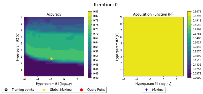 上图中的滑块,显示了“改善概率”(PI)采集函数在寻找最佳超参数方面的工作。