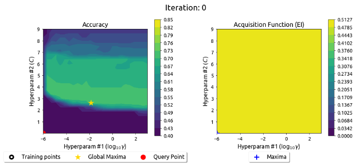 从上图中,看到我们在几次迭代中达到了全局最大值。在前几次迭代中,我们的代理模型在x∈[2,4]中具有较大的不确定性。采集函数先探索具有高期望值的区域,这导致了区域x∈[2,4]具有高度不确定性。此观察结果还表明,我们无需构造黑盒函数的准确估计即可找到其最大值。
