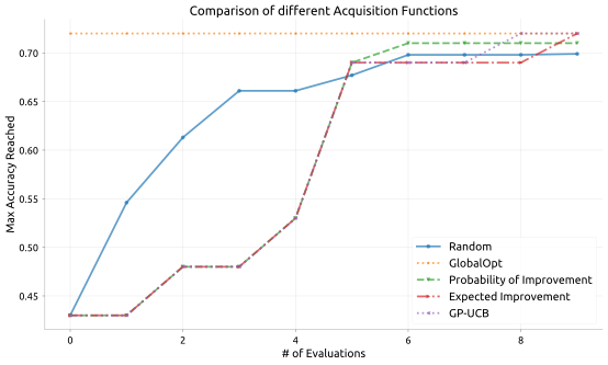 上图显示随机采集函数的性能还不错!但是如果我们的优化更为复杂(更多维度),那么随机采集的效果可能会很差。它们是评估点效用的启发式方法;
