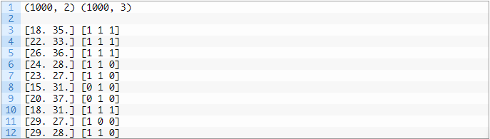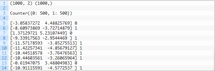首先运行示例代码,对创建的数据集进行汇总并显示1000个示例分为输入(X)和输出(y)元素的数据集。然后这段代码将汇总类标签的分布,显示样本属于类0或类1,并且每个类中有500个示例。接下来,这段代码会为我们展示数据集中的前十个样本属于类0还是类1