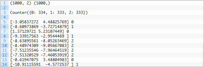 首先运行这段示例代码,它将会对创建的数据集进行汇总并显示1000个样本分为输入(X)和输出(y)元素的数据集。然后汇总的类标签的分布,显示样本属于类0,类1或类2,并且每个类中大约有333个样本。接下来,汇总数据集中的前10个样本,显示输入值是数字,目标值是对应类别的整数。