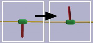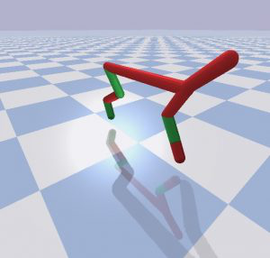 InvertedPendulumSwingup任务的起始状态和目标状态。绿色胶囊沿着黄色杆滑动,目的是使红色杆平衡直立。