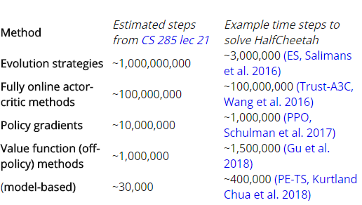样本效率在同一类算法中的实现之间有很大的差异,我发现幻灯片中的估值相对于文献中的特定示例来说可能有些夸大。特别是,OpenAI的进化策略论文提出了一种比TRPO具备更高的样本效率的方法,即一种策略梯度方法,用它来与TRPO作比较。报告称:HalfCheetah 的解决方案花费了300万个时间步长,远远低于Levine的10亿个步长的估值。