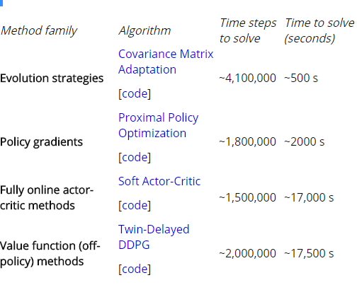 上表很好地说明了不同算法所需资源之间的相对关系:样本效率最高的算法(soft actor-critic)需要大约一半的步长,但消耗了34倍的CPU时间。双延迟DDPG(又称TD3)和soft actor-critic算法的稳定性低于其他算法。