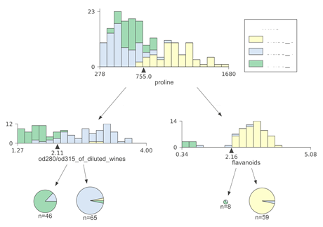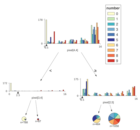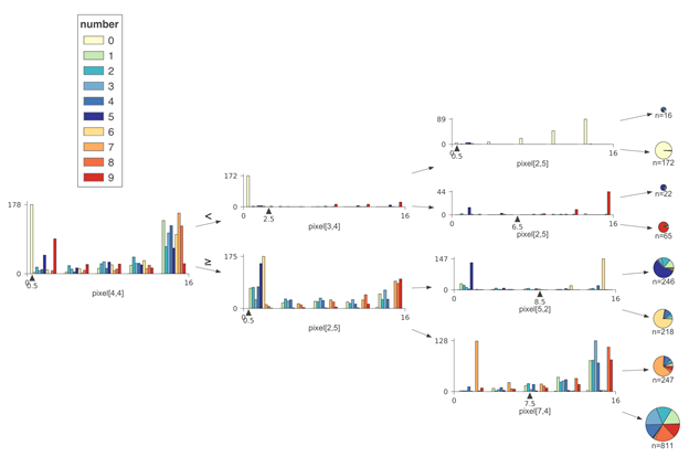 为了更清楚地显示不同类别的特征空间,我们使用了堆叠直方图。值得注意的是,堆叠直方图在Y轴上的高度是所有类别的样本总数。多个类别的计数相互叠加。当类别多于四或五个时,堆积直方图可读性很低,因此我们建议在这种情况下将直方图类型参数设置为不堆积的直方图。在基数较高的目标类别下,重叠的分布更难以可视化,并且出现问题,因此我们设置了10个目标类别的限制。使用10类Digits数据集(使用非堆叠直方图)所构成的一个比较浅的决策树的示例如下: