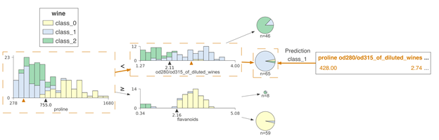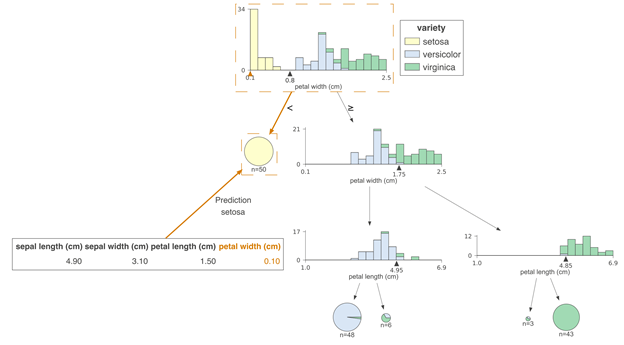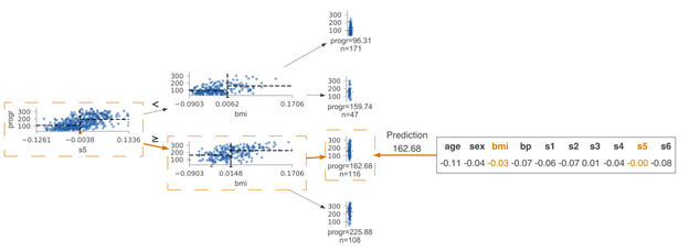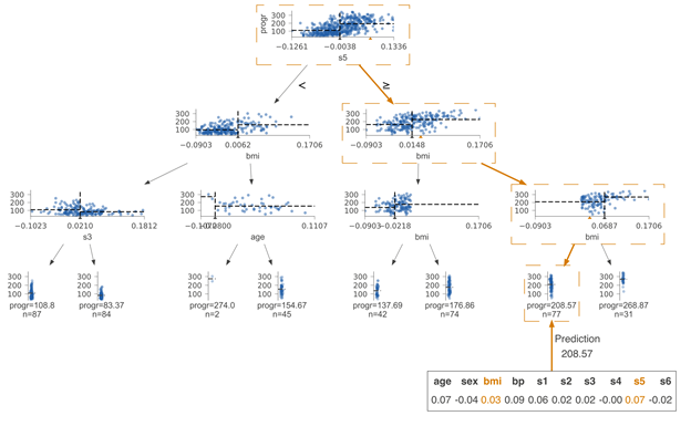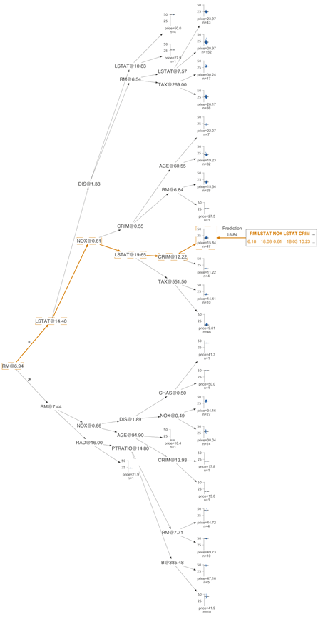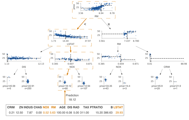 通过了解拆分决策节点的特征空间的过程,我们能直观地看到决策树是如何得到具体的预测结果的。现在让我们看一下如何将预测新样本的过程可视化。此处的关键是可视化从根到叶节点的路上所做出的决策。节点内的决策很简单:如果测试向量x中的特征xi小于分割点,则归类到左子树,否则归为右子树。为了突出决策过程,我们必须重点强调比较操作。对于沿叶子预测变量节点路径的决策节点,我们在水平特征空间中的位置xi处显示了橙色三角形。如果橙色三角形位于黑色三角形的左侧,则沿左路径,否则沿右路径。预测过程中涉及的决策节点被带有虚线框的框包围,边缘较粗且呈橙色。以下为两个测试向量的示例树: