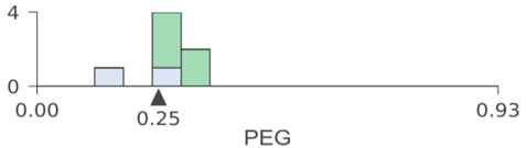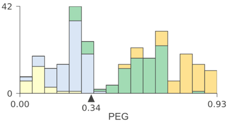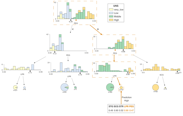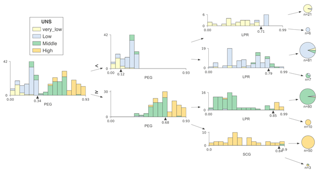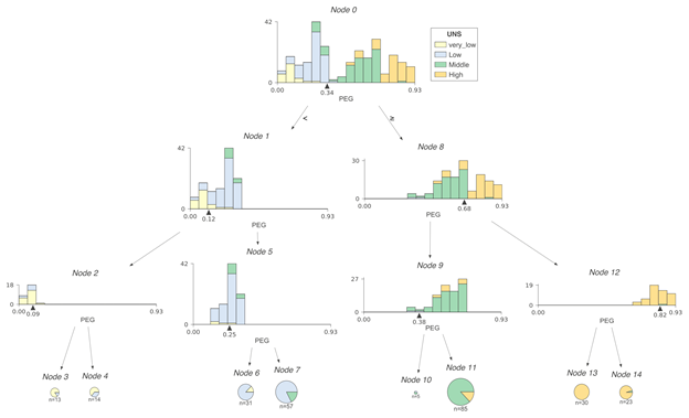 在这一案例中,直方图显示了PEG特征空间分布,而颜色则体现了特征与目标类别之间的关系。例如,在节点0中,我们可以看到具有very_low目标类别的样本聚集在PEG特征空间的左端,而具有high目标类别的样本聚集在右端。与回归树一样,左子树的特征空间和父节点上直方图分割点左侧的特征空间相同;右子树也同理。例如,将节点9和12的直方图组合起来,可以得出节点8的直方图。我们将PEG决策节点的水平轴限制在相同范围,因此位于下方的直方图中的范围更窄,这也意味着分类更纯净。