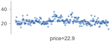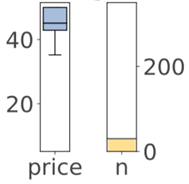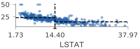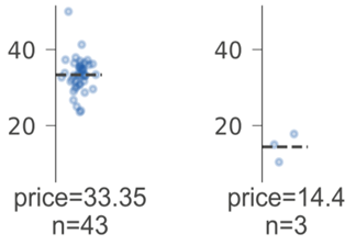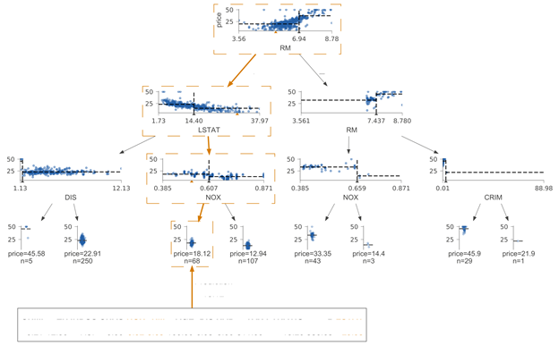 回归叶节点在垂直方向上显示相同范围的目标空间。相比于箱状图,我们选择了带状图,因为带状图能更好地表示分布,并隐含地以点数表示样本数。(我们还用文字标示了叶子节点的样本数。)关于叶节点的预测值,我们选择了带状图的质量(均值)分布中心,同时,我们使用了虚线来将其突出显示。