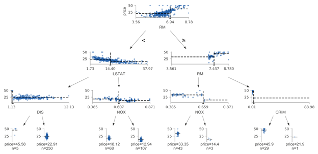 同样,在scikit树中,我们不能直观地理解颜色的用途,但是在进一步研究后,我们发现颜色较深的图像表示较高的预测目标值。如前文所述,在我们的解决方案中,决策节点下能够显示特征空间分布,比如该案例就使用了特征-目标值散点图,在叶节点总使用带状图显示目标值分布,其中点更密集的叶节点意味着该叶节点下有更多的样本。同样,我们来考察以下R语言下的可视化决策树的软件包,该软件包的结果与scikit类似,但边缘标签的效果更好: