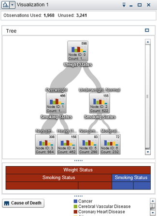 SAS和IBM同样提供(均不支持Python语言)决策树可视化。我们发现SAS的决策节点包括与该节点的样本目标值和其他详细信息有关的条形图: