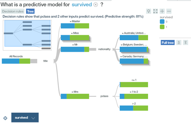 在这一案例中有一个很好的idea,就是通过边缘宽度来体现子树中的样本量。但是由于缺少水平轴,这些条形图的解释性并不如意。测试类别变量的决策节点(上图)每个类别仅具有一个条形,因此它们只能表示简单的类别计数,而不是特征分布。对于数字特征(下图),SAS决策节点显示目标值或特征值的直方图(我们无法从图像中分辨出)。SAS节点条形图/直方图似乎只是在说明目标值,这并没有告诉我们有关特征分割的信息。下侧的SAS树似乎突出显示了新样本的预测过程,但我们无法从其他工具和库中找到任何其他示例,这样的功能似乎并不常见。再来考察IBM软件的情况。它在泰坦尼克数据集中表现出了非常不错的可视化效果,甚至结合IBM的Watson分析以条形图的形式显示了决策节点类别的计数: