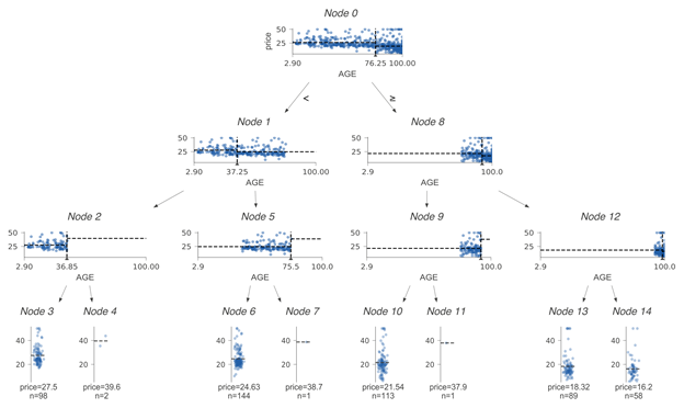 除了动画的要素之外,该可视化还具有此前提到的三个独特特征:尽管该案例是出于教学目的而开发的基于hardcoded技术的可视化动图,但它给我们指明了正确的方向。除了《机器学习的可视化简介》中的动画外,我们找不到另一个能够更好说明如何在决策节点(特征目标空间)处分割特征值的案例了。而这一点恰恰是在决策树模型训练期间进行操作的关键点,也是新手应该关注的点,因此我们借鉴这一方案,从检查分类树和回归树的决策节点开始我们的可视化工作。同行,我们通过训练数据学习到决策节点选择特征xi并在xi的值域(特征空间)进行分割,将具有相似目标值的样本分到两个子树中的一个中。准确地说,训练过程中需要检查特征和目标值之间的关系。因此,除非我们的可视化工作在决策节点上显示了特征-目标空间,否则读者很难根据可视化图像来直观理解得到预测结果的整个过程和原因。为了突出现实决策节点是如何分割特征空间的,我们以单特征(AGE)的回归树和分类树作为展示。这个案例使用波士顿房价数据中的单个特征(age)来训练回归决策树。为了便于讨论,在下图中加入了节点id:附生成效果图的代码: