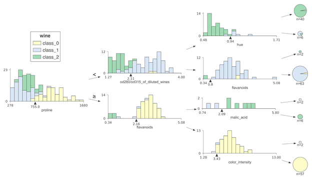 viz= dtreeviz(clf, wine.data, wine.target, target_name='wine',
