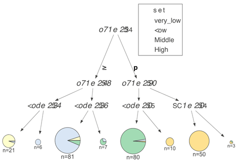 尽管在决策树的可视化过程中一般不适用饼状图来进行呈现,但我们还是选择了使用它来体现叶节点的分类。我们通过观察图中是否有明显占主导的颜色,就可以评判分类结果的纯度。饼图最大的缺陷是无法体现元素间具体的关系。我们仅仅能从其中主导的颜色决定该节点的预测结果。