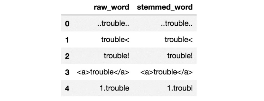 请注意,上面的所有原始单词都有一些周围的噪音。如果你对这些词进行词干提取,你会发现结果看起来不太漂亮。他们都没有正确的词干。但是,通过这个笔记本中写的一些噪音清除,结果现在看起来好多了: