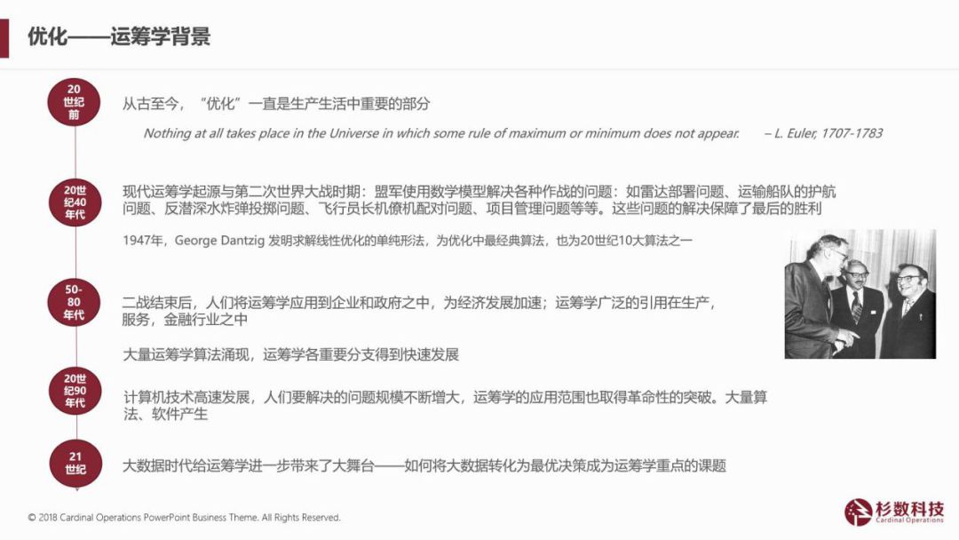 数学家欧拉曾提出:从古至今,“优化”一直是生产生活中的重要的部分。在二战期间,现代运筹学曾在战场上发挥巨大作用;直至二战结束后,世界经济开始复苏,运筹学也被广泛的运用到金融、生产等领域,其分支也得到相应发展。到20世纪90年代,计算机科学高速发展,人们要解决的问题规模不断增大,运筹学的应用范围也取得革命性的突破。21世纪,大数据时代来临,给运筹学带来更大的舞台,如何将大数据转化为现代商业生产环境下的最优决策,成为运筹学的重点课题。