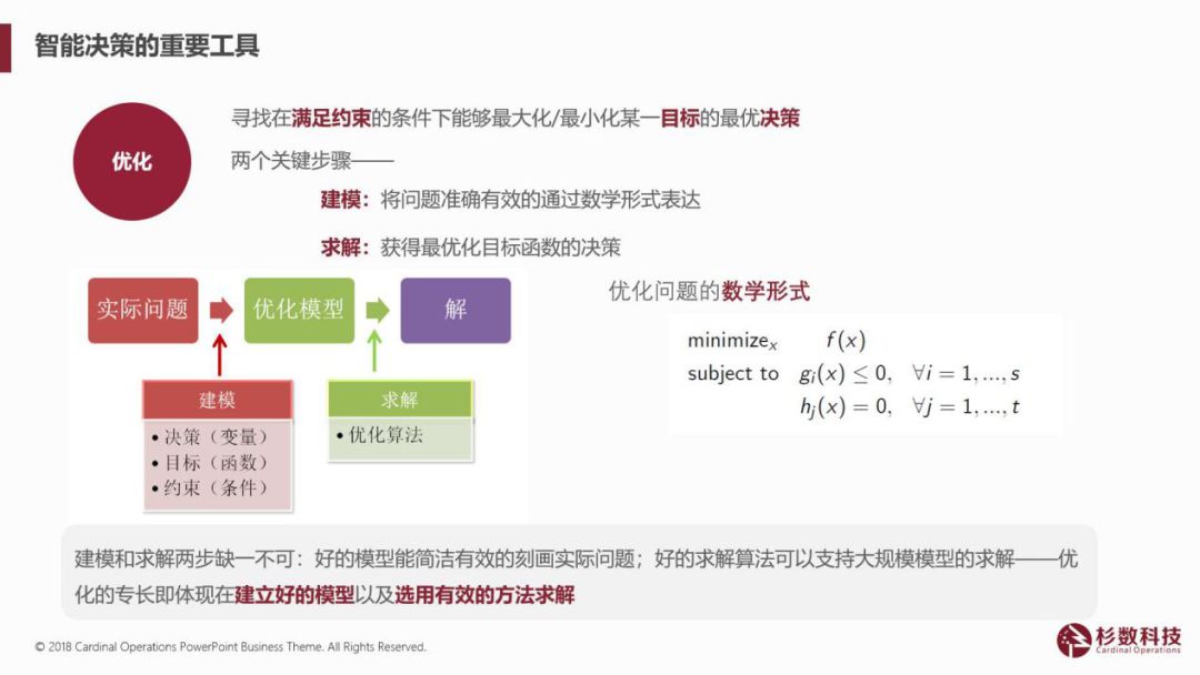 在优化过程中,建模和求解是两个关键步骤。建模,将想要优化解决的问题,通过准确有效的数学模型或数学形式来表达出来。第二个是有一个很好的数学模型之后,怎样通过高效的方法,将这个模型进行高效地求解。优化问题的数学形式往往是有这样一个形式:一个优化目标,可以是最大化也可以是最小化,同时有一个决策变量用x表示,为了优化x可以遵循一定的约束条件,可以是不等式,也可以是等式。