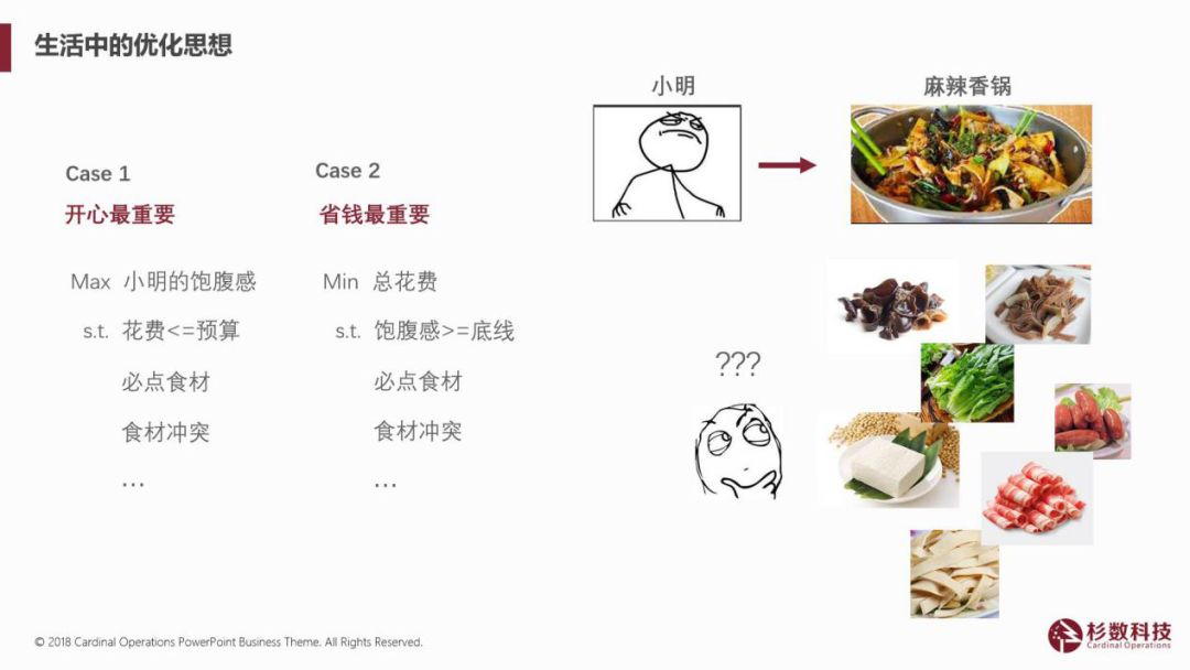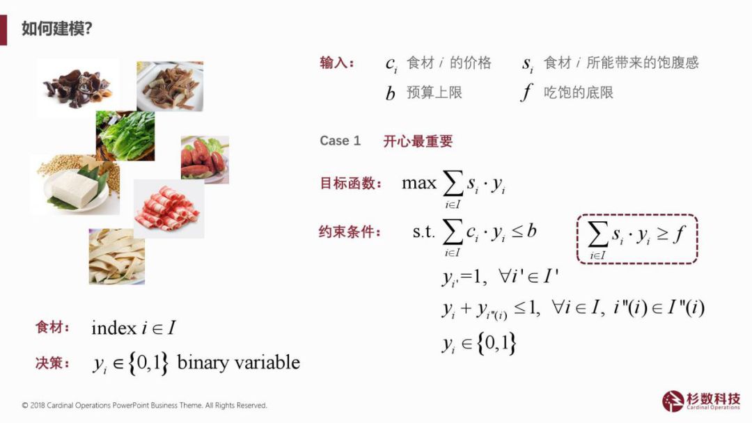还有一些其他方面的输入:预算上限、吃饱底线、食材价格及食材带来的饱腹感。第一个Case目标函数为si乘以yi的加和,表示选中的所有食物带来的饱腹感的加和能够最大化。约束条件:首先花费要小于等于预算,其次必点的菜则i固定的等于1,当菜系发生冲突,点了某一种菜,另一种菜一定不点,这就用两个点跟i相对应。另外一个集合当选了i的时候,不选的一个集合,让这两个y相加等于1,就意味着最多只有一个1,最后要定义y是原因变量,只能取0或者1。