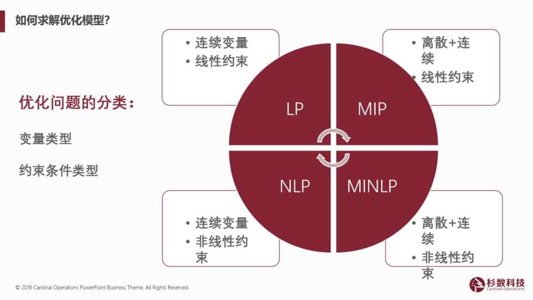 优化问题可以按照变量类型和约束条件类型被分成四种类型。LP所有的变量都是连续变量,约束都是线性约束。在它的基础上,如果能够既涉及到了离散变量,同时也有连续变量就是MIP;基于LP,如果说有非线性的约束,就是NLP;MINLP是最复杂的一种类型,包含了另外三种情况的总和。