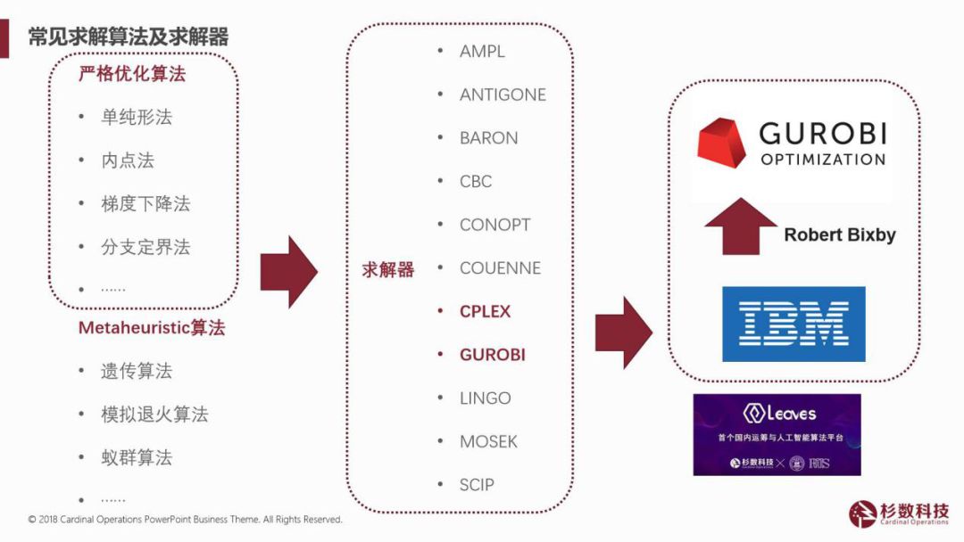 在高性能算法中,大致分为两类:严格优化算法和Metaheuristic算法。严格优化算法更好进行说明,在数学上更容易证明,所以在学术界更受欢迎;而Metaheuristic算法在应用上更有优势。求解器相当于包装很多算法的“盒子”,像MILP这样的混合整数线性优化问题,只要满足通用形式,按照标准输入“盒子”就可以快速求解。在上述的求解器中,GUROBI和CPLEX是最有名的求解器。这两个求解器都跟IBM有关,IBM旗下CPLEX的创始人之一后来出走,和另外几个人一起创建了GUROBI。目前,这两家占据了通用商业求解器的绝大部分市场份额。杉数也研发了自己的一个求解器,是中国首个由华人开发的数学规划求解器及机器学习算法套件,打破了西方在这方面的技术垄断,具有很重要的历史意义。