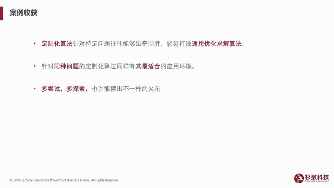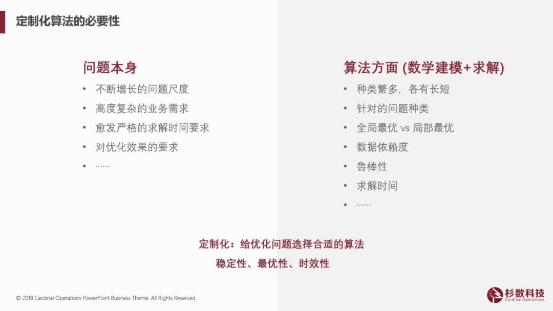算法的必要性可以从其问题本身和算法两个方面进行分析。算法定制化的目的,是给优化问题选择合适的算法,而选出合适的算法主要从三个维度进行衡量:1.稳定性,即在不同的参数和场景下都能给出很好的解。优化效果能够保证,不能因改变参数而使效果降低很多;同时求解时间要相对稳定。2.保证求解达到最理想化,或距离最优解偏差越小越好。但有时要将求解时间控制在一定范围内,会牺牲求解的最优性。3.时效性,在客户需求的范围以内能够求出最优解。