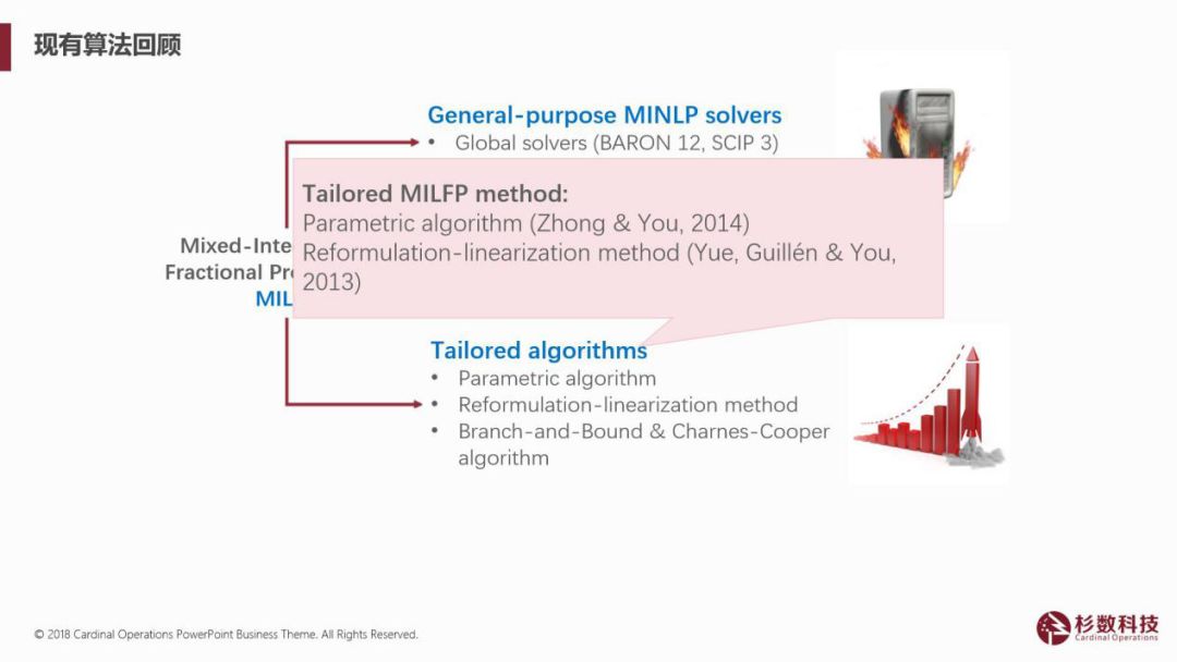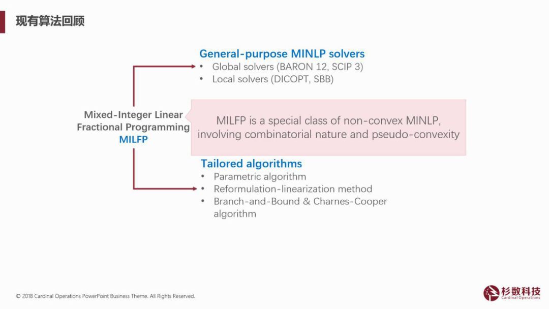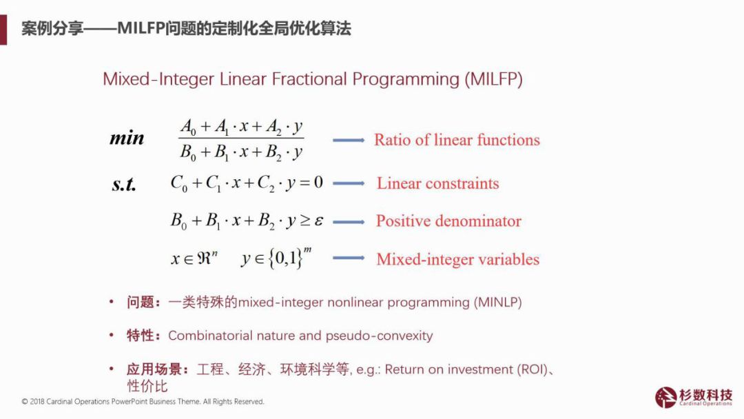 MILFP,是一种特殊的混合整数非线性的问题。其主要目标函数是两个线性方程的比值,其他所有的约束条件都是线性的。假设分母为正,则该线性方程用大于等于符号,这个符号是相对小的数比如0.01,但不能太小,这是一个混合整数问题。该问题有非线性的目标函数,因此是一类特殊的MILFP的问题。该目标函数是一个分式形式,其特性是具有组合性质和伪凸性。其应用在工程、经济、环境科学等环境中,例如投资回报率及购买物品时所提到的性价比。