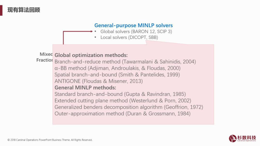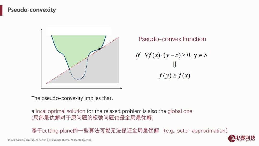 Pseudo-convexity(伪凸性),如图所示函数,只要梯度是正的,在这个方向上就一直增长。基于Cutting plane在图中所标示的黑点会加一个Cut,这就切掉了一部分可行域,这样可能无法找到全局最优解,只能找到替代的局部最优解。它是特殊的MINLP的问题,部分算法能够求解全局最优的点,也有一些算法只能保证局部最优,当然还可以用通用的MINLP solvers求解,当然最理想的情况还是采用定制化的算法。