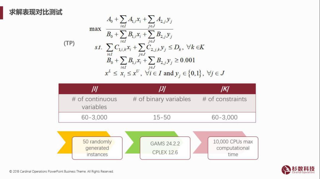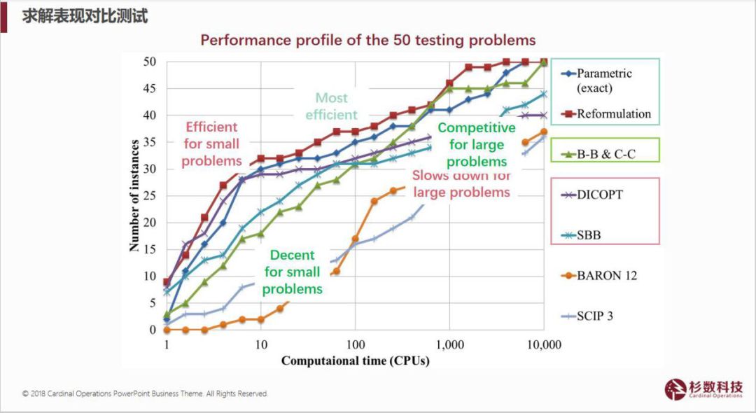 最后,在给定100秒,第三种定制化算法比不过另外4种算法,但它的好处是能够保证全局最优。当给出的固定时间在100秒的时候,求解出来的问题数量已经和SBB打平手,给定1000秒的时候,其实已经能够和前两种定制化算法基本一样,甚至赶超了。而且,可以看到当在10000秒最大计算时间的时候,只有前三种定制化算法完成了所有50个问题的求解。但其他商用的求解器没有实现完成50个的全部求解。通用的MINLP求解器最终只解决了36到37个问题,他们最通用,任何MINLP问题都可以求解,但计算效率的差距非常大。