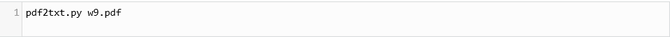 伴随着PDFMiner一起的pdf2txt.py命令行工具会从一个PDF文件中提取文本并且默认将其打印至标准输出(stdout)。它不能识别文字图片,就像PDFMiner不支持光学字符识别(OCR)一样。让我们尝试用最简单的方法来使用它,那就是仅仅传递给它一个PDF文件的路径。我们会使用w9.pdf文件。打开一个终端并且定位到你存放PDF文件的位置,或修改一下命令指向待处理文件: