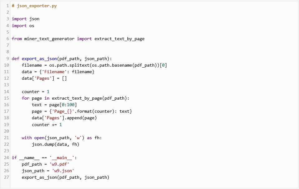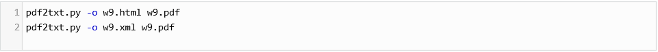 你也可以使用PDFMiner的命令行工具,pdf2txt.py和dumppdf.py,来为你执行导出工作。如果你不想试图自己弄明白PDFMiner。根据pdf2txt.py 的源代码,它可以被用来导出PDF成纯文本、HTML、XML或“标签”格式。
