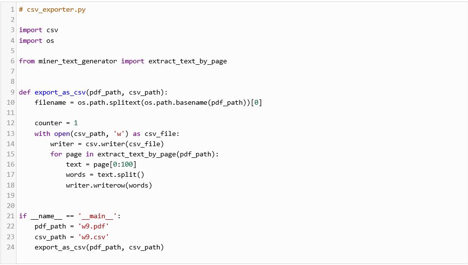 Python有一个内置的csv 模块,你可以用它来读写CSV文件。在这里我们将用它从我们由PDF中提取的文本来创建一个CSV。让我们看一下代码: