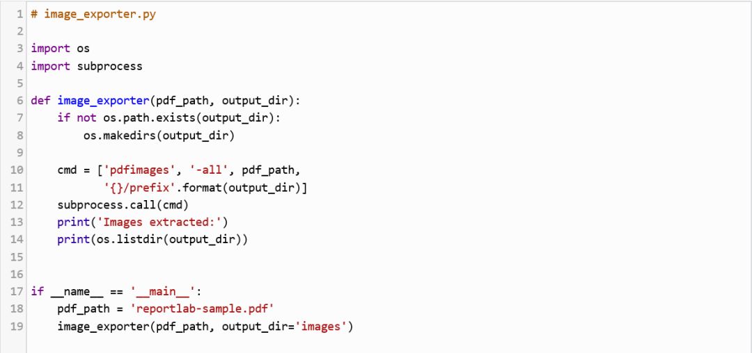 在这个例子中,我们引入了subprocess和os模块。如果输出路径不存在,我们会尝试创建它。然后我们运用subprocess的call函数来执行pdfimages命令。使用call函数是因为它将等到 pdfimages命令完全执行完才返回。你可以代之以Popen,但是那将基本上在后台运行命令进程。最后,我们打印出输出路径下的细节,以确定所有的图片都被提取进了其中。