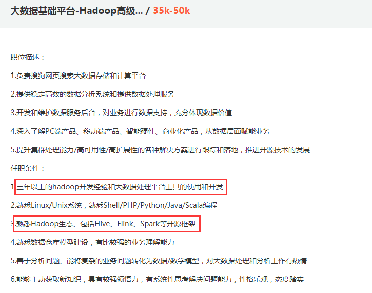 像字节跳动等头部企业,往往很重视 Hadoop 源码的二次开发,对简历职级要求比较高,还需要应聘者具有源码阅读经验。