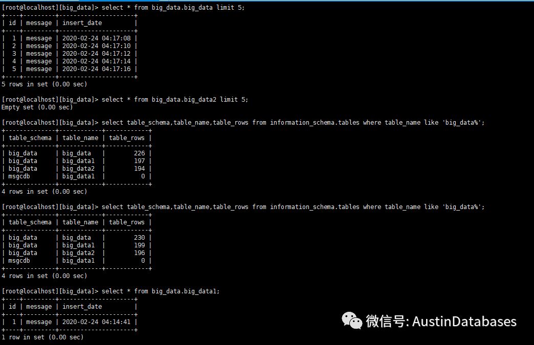 然后执行三个存储过程,存储过程在执行的时候,明显 big_data 数据可以查询,但big_data1 的表只能查出一条数据, big_data2 表干脆就反馈empty set
