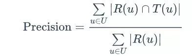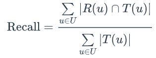 网站在提供推荐服务时,一般是给用户一个个性化的推荐列表,这种推荐叫做TopN推荐。TopN推荐的预测准确率一般通过准确率(precision)/召回率(recall)度量。令 R(u) 是根据用户在训练集上的行为给用户作出的推荐列表,而 T(u) 是用户在测试集上的行为列表。那么,推荐结果的召回率定义为: