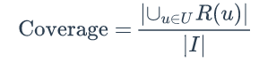 覆盖率(coverage)描述一个推荐系统对物品长尾的发掘能力。覆盖率有不同的定义方法,最简单的定义为推荐系统能够推荐出来的物品占总物品集合的比例。假设系统的用户集合为 U,推荐系统给每个用户推荐一个长度为N的物品列表R(u)。那么推荐系统的覆盖率可以通过下面的公式计算: