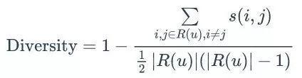 定义了物品 i 和 j 之间的相似度,那么用户 u 的推荐列表 R(u) 的多样性定义如下: