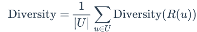 而推荐系统的整体多样性可以定义为所有用户推荐列表多样性的平均值: