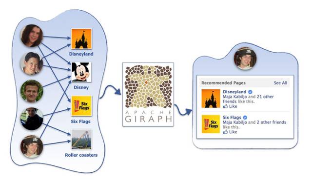 Facebook中推荐系统所要面对的数据集包含了约1000亿个评分、超过10亿的用户以及数百万的物品。相比于著名的Netflix Prize ,Facebook的数据规模已经超过了它两个数据级。如何在大数据规模情况下仍然保持良好性能已经成为世界级的难题。为解决这一难题,Facebook团队使用一个分布式迭代和图像处理平台——Apache Giraph作为推荐系统的基础平台。