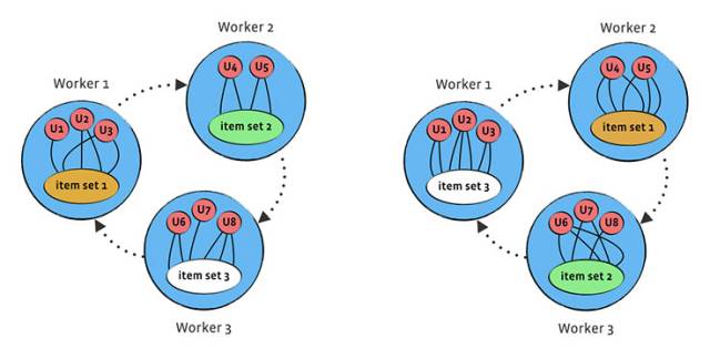 综合以上可以看出,Giraph中最大的问题就在于每次迭代中都需要把更新信息发送到每一个顶点。为了解决这个问题,Facebook发明了一种利用work-to-work信息传递的高效、便捷方法。该方法把原有的图划分为了由若干work构成的一个圆。每个worker都包含了一个物品集合和若干用户。在每一步,相邻的worker沿顺时针方法把包含物品更新的信息发送到下游的worker。这样,每一步都只处理了各个worker内部的评分,而经过与worker个数相同的步骤后,所有的评分也全部都被处理。该方法实现了通信量与评分数无关,可以明显减少图中数据的通信量。而且,标准方法中节点度分布不均匀的问题也因为物品不再用顶点来表示而不复存在。为了进一步提高算法性能,Facebook把SGD和ALS两个算法进行了揉合,提出了旋转混合式求解方法。