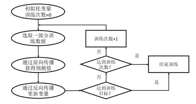 TensorFlow是一个基于神经网络的深度学习框架。对于Softmax这样的模型,被当作是不含隐藏层的全连接神经网络。通过调整神经网络中的参数对训练数据进行拟合,可以使得模型对未知的样本提供预测的能力,表现为前向传播和反向传播(Backpropagation)的迭代过程。在每次迭代的开始,首先需要选取全部或部分训练数据,通过前向传播算法得到神经网络模型的预测结果。
