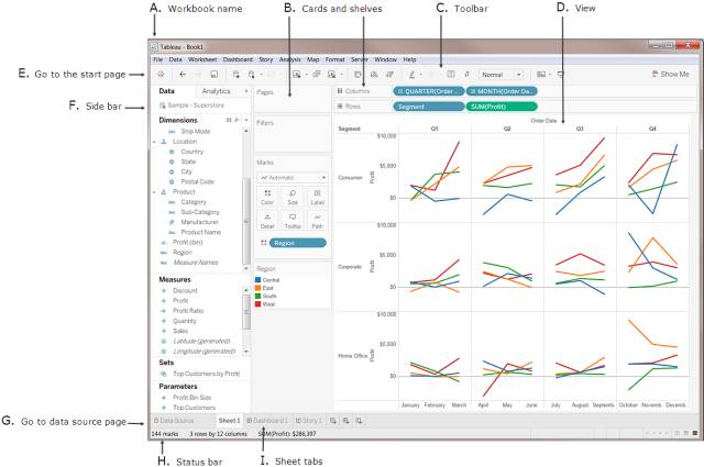 Tableau 工作区包含菜单、工具栏、“数据”窗格、卡和功能区以及一个或多个工作表,表可以是工作表、仪表板或故事。