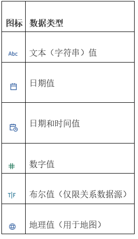 数据源中的所有字段都具有一种数据类型。数据类型反映了该字段中存储的信息的种类,例如整数 (410)、日期 (1/23/2015) 和字符串(“Wisconsin”)。字段的数据类型在“数据”窗格中由以下所示的图标之一来标识。