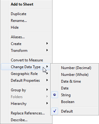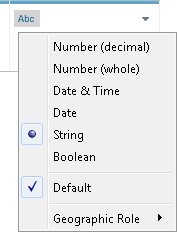 提示:确保在创建数据提取之前更改数据类型。否则,数据可能会不正确。举例来说,如果 Tableau 将原始数据源中的浮点字段解释为整数,并且您在更改字段的数据类型之前创建数据提取,则 Tableau 中生成的浮点字段的部分精度将被截断。