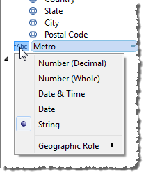 若要在“数据”窗格中更改字段的数据类型,请单击字段名称左侧的图标,然后从下拉列表中选择一种新数据类型。