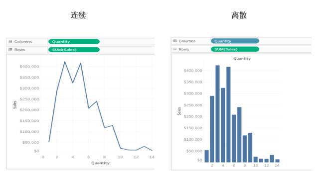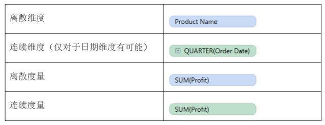 Tableau 将字段分配给“维度”区域或“度量”区域进行初始分配时建立了默认值。当您单击并将字段从“数据”窗格拖到视图时,Tableau 将继续提供该字段的默认定义。如果从“维度”区域中拖动字段,视图中生成的字段将为离散字段(带有蓝色背景);如果从“度量”区域中拖动字段,生成的字段将为连续字段(带有绿色背景)。