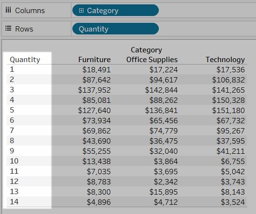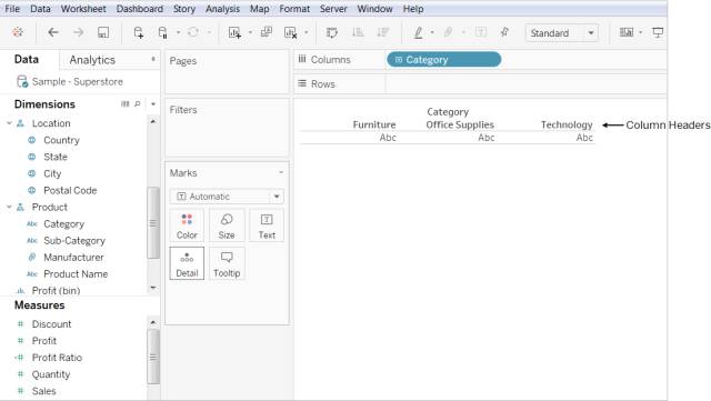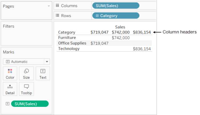 当您单击并将字段从“维度”区域拖到“行”或“列”时,Tableau 将创建列或行标题。